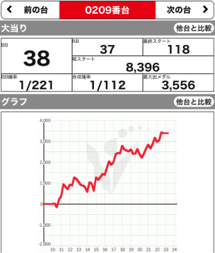 209 💮 | マイジャグ | 9200G | +3300 | 38:37 1/111.5 | 111.9% |
