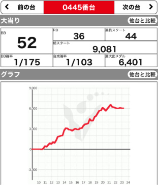 445 💮 | マイジャグ | 10000G | +5900 | 52:36 1/107 119.4% |