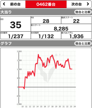 462 ⭕ | マイジャグ | 9000G | +1000 | 35:28 1/134 103.6% |