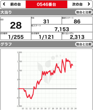 546 💮 | マイジャグ | 7800G | +1300 | 28:31 1/124 105.4% |