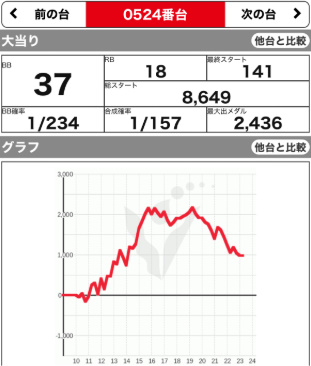 | 524 ⭕ | マイジャグ | 9300G | +1000 | 37:18 1/157 103.4% |