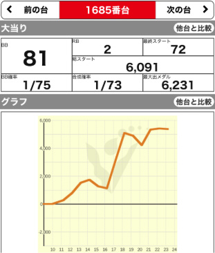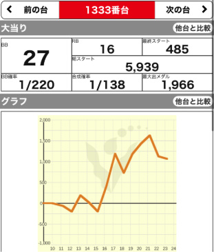 | 1333 ⭕ | マイジャグ | 6400G | +1100 | 27:16 1/138 105.4% |
