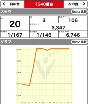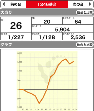 | 1346 💮 | マイジャグ | 6400G | +1500 | 26:20 1/128 107.7% |