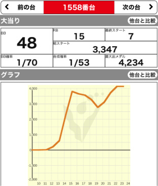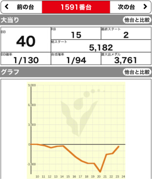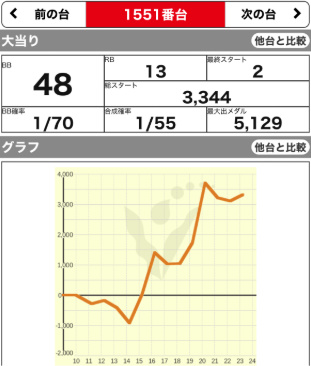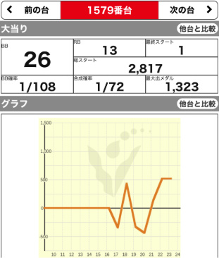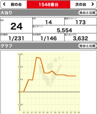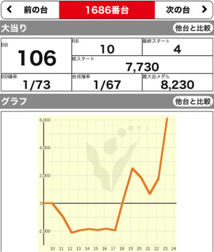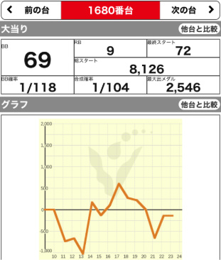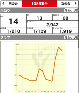 | 1355 💮 | マイジャグ | 3200G | +1200 | 14:13 1/109 112.0% |