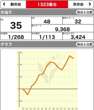 | 1323 💮 | マイジャグ | 10100G | +2500 | 35:48 1/113 108.0% |