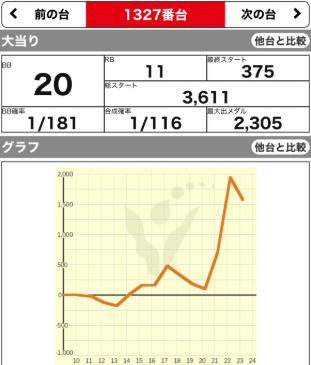 | 1327 💮 | マイジャグ | 4000G | +1600 | 20:11 1/116 112.8% |