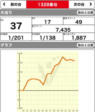 | 1328 ⭕ | マイジャグ | 8100G | +1600 | 37:17 1/138 106.4% |