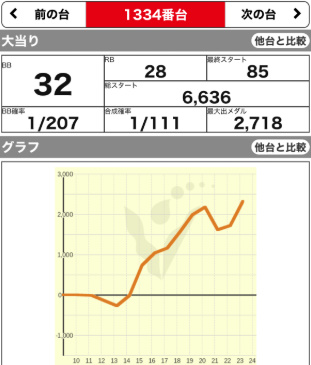 | 1334 💮 | マイジャグ | 7300G | +2300 | 32:28 1/111 110.3% |