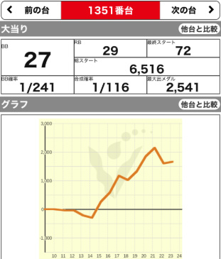 | 1351 💮 | マイジャグ | 7100G | +1600 | 27:29 1/116 107.6% |