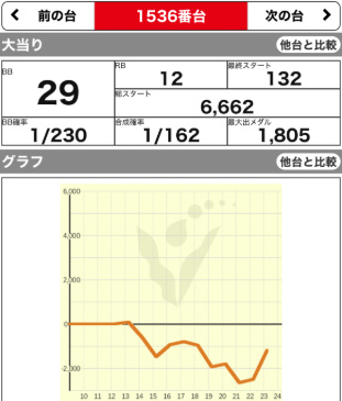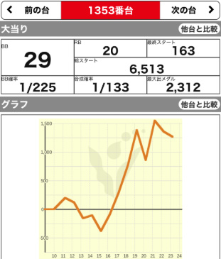 | 1353 ⭕ | マイジャグ | 7100G | +1300 | 29:20 1/133 105.8% |