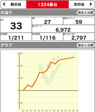 | 1324 💮 | マイジャグ | 7600G | +2600 | 111.4% | 33:27 1/116 |