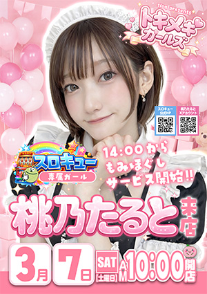 ![]() | 📅7日(土) 🌟トキメキガールズ 🍑桃乃たると 来店(抽選~) ▶Dステーション39新開地店 ※もみほぐしタイムあり💕 |